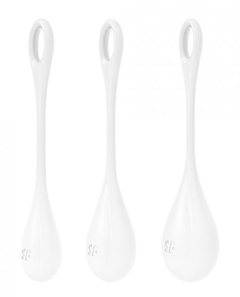 With the Satisfyer Yoni Power 1 you can strengthen your pelvic floor and enjoy even more intense orgasms. In contrast to pelvic floor exercises with other Ben Wa balls, the focus of the Yoni Power 1 is not just on the weight, but above all on the size of the balls: You start with the largest and heaviest ball, wear while standing, (3 cm diameter, 74 g) and work your way through the medium (2.5 cm diameter, 46 g) to the smallest and lightest ball (2 cm diameter, 22 g). The more frequently you do the pelvic floor training, the tighter your muscles become, so you can eventually hold the ball with the smallest circumference. You only have to use the balls for 15 minutes a day to achieve an effect that not only you, but also your sweetheart will notice during vaginal intercourse. The ribbed structure of the round balls also stimulates you during training.