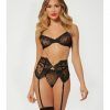 Scalloped lace padded bra with gold chain and elastic bra straps, gold center U ring, matching garter belt with gold center U ring and matching thong panty with gold chains.