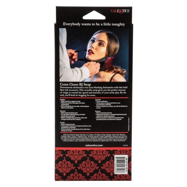 Scandal Come Closer BJ Strap from California Exotic Novelties. Come Closer BJ Strap pushes deep penetration even further and lets you explore new angles of pleasure. Strap in for the ride of your life with this multi-talented love sling. Perfect for season fetishists or blushing beginners, the designer fabric, plushy lining and adjustable handles thoughtfully combine comfortable with desire. For any naughty night, this versatile strap can be used for deep penetration or finding just the angle for knee-shaking pleasure. The multi-use strap lets your lover take full control of your pleasure and allows them to effortlessly pull you into any position they like. Give yourself to your lovers exotic whims by slipping into the designer harness and experiment with passionate power play. Specifications: Color Black. Materials Polyester, Polypropylene. Features Phthalate free. AllergensN/A. 1 year warranty. Measurements 22 inches by 4.25 inches BJ Strap. Bulk weight2 ounces. Package 3.6 ounces. Package1.5 inches by 4.5 inches by 10.25 inches.