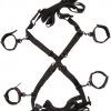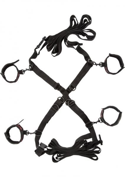 Scandal Over the Bed Cross style bed restraints. Includes totally adjustable and detachable universal wrist and ankle cuffs. Soft and plushy on one side,with designer fabric on the other. Universal clasps and D-rings with swivel design. Safe and pure for body and pleasure made using phthalate free materials: Polyester fabric, lining, Velcro, Polypropylene PP straps, buckles, Acrylic dowels, Nickel free Alloy clasps, Nickel free iron D-rings. Adjustable to fit mattresses up to California King size. Straps adjust up to 180 inches. Cuffs adjusts up to 14.5 inches. Bulk weight 16.1oz.