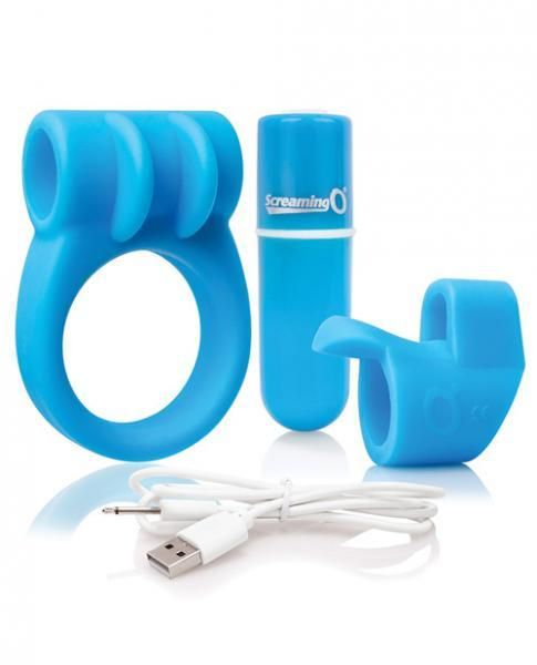 Screaming O Charged Combo Better Sex Kit number 1 with Cock Ring and Finger Sleeve Blue. Enjoy the all in one fun with Combo a complete better sex kit powered by a deep rumbling Vooom vibrations. This convenient collection includes a stretchy two sided cock ring and comfortable fingertip sleeve both made with body safe True Silicone. For the widest variety at a value price. Includes Rechargeable deep rumbling bullet vibe, True Silicone two sided cock ring, finger sleeve. USB recharge cable, instruction booklet. Special features 10 functions with easy one touch control. Two sided True Silicone Cock Ring. Comfortable True Silicone finger sleeve.