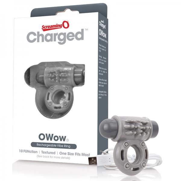 Screaming O Charged O Wow Ring Gray. The Charged O Wow is the ultimate rechargeable vibrating cock ring, featuring a brand new low pitch motor for a distinctly different sensation that both partners can feel deep inside. This powerful sex toy for couples boasts 10 penetrating vibration and pulsation functions that rumble, rather than buzz, and provide an undeniably more satisfying experience.