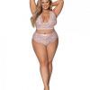 From the Exposed by Magic Silk collection, this style includes: a lace bralette featuring, adjustable shoulder straps with blush tone sliders, a strappy back design with with a blush toned o-ring, swan hook closure in the back, and a matching lace short featuring a ribbon-like strap.