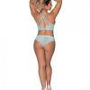 From the Exposed by Magic Silk collection, this style includes: a lace bralette featuring, adjustable shoulder straps with turquoise tone sliders, a strappy back design with with a turquoise toned o-ring, swan hook closure in the back, and a matching lace short featuring a ribbon-like strap. Soft floral lace is paired with ribbon-like straps in a wash of pale turquoise. 90% Nylon, 10% Spandex. Hand Wash Cold. No Bleach. Dry Flat. S/M – Size 4-10. Waist : 28in.-34in.