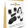 Upgrade your naughty bondage collection with this sophisticated set of kinky accessories that is perfect for an unforgettable intimate experience. Included in the Midnight Special Set is a beautiful pair of cuffs made of black, sheer ruched material that feel soft against the skin. For a firmer grip, this set also includes bondage rope that can be used to restrain your partner. You will be able to explore sensation play with the included blindfold and a whip for mixing pleasure and pain. Cute bowtie nipple pasties complete the set, allowing you to play dress up for role play fantasies.