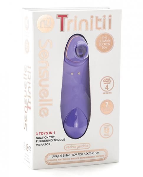 Sensuelle Trinitii Ultra Violet Clitoral Vibrator 15 functions and modes. 3 toys in 1. Unlike anything you have experienced before. Suction toy, Flickering Tongue and Vibrator. Rechargeable vibrations.