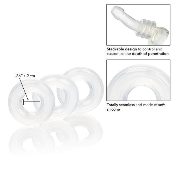 The Set of 3 Silicone Stacker Rings will transform uncomfortable penetration into a truly plush and comfortable experience. The flexible cock rings can be stacked or used independently to help control and customize depth of penetration. Our customizable silicone ring stack fit snuggly on you to provide a soft, pillow-y cushion for your partner.