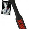 The Sex and Mischief XOXO Paddle in Black. This black vinyl paddle features a red cheeky XOXO design that leaves a sexy impression on your partner!