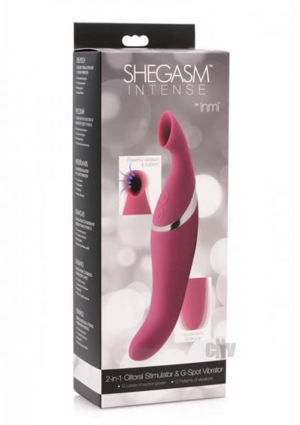 Experience simulated oral sex and buzzing bliss with a rechargeable sex toy that sucks on your clitoris and vibrates within you! Play with 11 levels of suction power and pulsing patterns when you place the tip around your clitoris. Turn the Shegasm Intense around and use the firm shaft to explore external and internal pleasure with 3 speeds and 7 functions of thrilling vibration. Find your perfect level, from a gentle purr to orgasmic nirvana! Made of premium silicone, this double ended pleasure tool is non-porous and phthalate free. Clean with mild soap and warm water and avoid use with silicone lubricants.