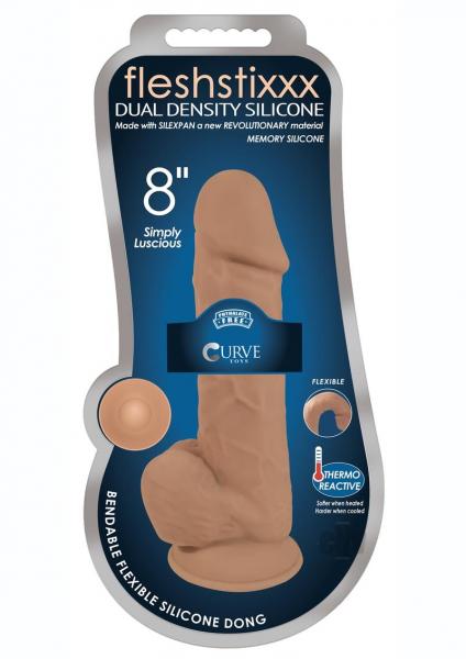 This ultra-premium, dual density dream is the last dildo youll ever need! Made with Curve?s revolutionary Silexpan Silicone formula that molds to your preferred shape, as well as providing the premium feel of dual density dongs. FleshStixx are dependable, satisfying dongs that give you what you need in a low maintenance package so you can focus less on caring for the dildo and more on caring for yourself! The exclusive Silexpan formula is Thermo Reactive ? heat these dongs up to make them softer and easier to mold, then cool them down to harden them in your preferred shape. The phallic head and sculpted veins feel like the real thing, and the lack of balls allows you to enjoy every inch of these Flesh shafts. The strong suction cup base allows you to plop these dildos on any smooth and flat surface, and makes them compatible with most strap on harnesses. Mold a FleshStixx to your dream shape and go for the most satisfying ride of your life! FleshStixx dildos are low maintenance so you can focus on your pleasure ? each dildo is hypoallergenic, latex free, and phthalate free for a body safe experience. These dildos can be boiled for 3 minutes for a quick sterilization and top rack dishwasher safe! FleshStixx dildos are compatible with water based lubricants only, avoid use with silicone based lubes to prolong the life or your dildo. Curve Toys is known for their ultra-realistic bio-skin formula used to create the best dildos and adult toys in the world. They manufacture their adult replica products in the USA with only body-friendly, phthalate-free, and top-grade materials. Their proprietary blend of bio-skin is mixed in-house, making them a leader in sexual health. All products are inspected for superior functionality so that they represent the value, quality, and innovation from the factory to the bedroom. Staffed by experts with over 60 cumulative years in the adult manufacturing, Curve Toys is the perfect combination of passion, creativity and experience; in short, we know pleasure. Made with a patented revolutionary formula for a realistic feel. Measurements: Total length 8.5 inches, insertable length 6 inches, width 2 inches Materials: Phthalate free silicone Color: Tan