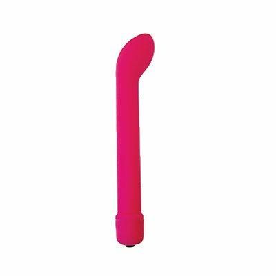 Silicone Vibrating G-Spot Massager Pink features 7 vibrating functions. Phthalate free. Waterproof vibrations. Silky smooth feel. This 7 function Silicone Prostate Massager is made from Phthalate free ABS plastic with a luxurious silicone skin. Vibrator requires 2 AAA batteries, not included. Uniquely angled tip for g-spot stimulation. 6.75 inches by 1.2 inches.