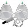 Measurements cups are 4.25 inches in inner diameter, 4.75 inches in depth. Tubing is 20.5 inches in length. Material ABS plastic. Color Clear. Note includes two large cups, hand pump, tubing, and an extra tip system.