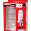 Size Matters Enhancer Sex Sleeve from XR Brands. Try this on for size! This thin, textured cock sheath is perfect for the man on the go. Now you can slip into instant erection enhancement, with no waiting, pills, or creams! The outer texture stimulates your lover with every thrust, and provides a subtle girth boost on any size. The stretch to fit design is open ended, designed for every man in mind. You can enjoy more intense climaxes and longer lasting performance with enhanced blood retention. Just slip the band behind your balls and slide the shaft onto your own. The extra strap ensures extra enhancement, and helps it stay firmly in place no matter how tight the hole or how hard you pound. The clear, stretchy Thermoplastic Rubber TPR lets you shine through and will match any skin tone for the most universal fit and feel available.