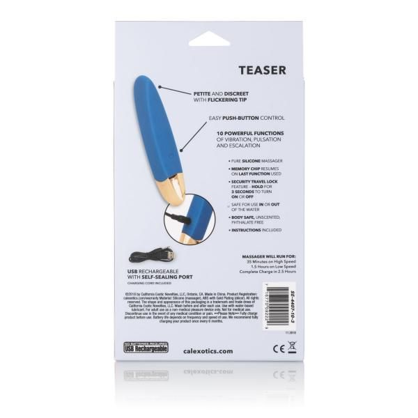 Slay Teaser Blue Bullet Vibrator from California Exotic Novelties. Color Blue. Materials Silicone, ABS Plastic with Metallic Plating. Power source USB Rechargeable, included. Features Phthalate free, waterproof, rechargeable, vibrates. 90 day warranty. Maximum run time 90 minutes. Maximum charging time 210 minutes. Measurements 4.5 inches by 1 inch overall. 2.5 inches by 1 inch vibrator. Bulk weight 1.6 ounces. Package 4.7 ounces, 2 inches by 4.75 inches by 8.5 inches.