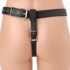 This thin profile harness lets more of you show through, for an exciting look and unrestricted feel. The simple thong style strap system goes around the waist, with a single thin strap running between the legs. The narrow leather strap supports the shining metal O-ring, and is placed just so, so you get stimulation with every thrust. The adjustable buckles ensure a tight fit on most any body type, and the metal O-ring will accept most flared base dildos up to 2 inches in diameter. The ring snaps into place, and can be swapped out with practically ANY size ring, letting you use whatever size dildo that tickles your fancy. The minimal coverage and versatile design makes for a truly exciting strap on harness.