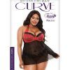 Sophia Halter Babydoll and Panty 1X/2X from Fantasy Lingerie Curve line. A mesmerizing silhouette, the Sophia babydoll and panty set is a must have. Fashioned with both romance and style, this babydoll set features a halter tie bra top and sheer skirt that drapes over the body. The simplicity of the soft black mesh is paired with a deep crimson red lace detailing overlay to complete the look with elegance. The crimson satin halter neck and back tie closure make this silhouette an easy and versatile fit.