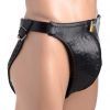 Keep your slaves cock confined in this evil leather jockstrap! Lock him into the luxurious leather straps to put him through a special kind of hell! The interior of the front panel is lined with hundreds of tiny, sharp spikes that will dig into your playthings delicate genitals. A zipper allows you to access his tormented flesh and permit him to urinate, but you can also secure the hole of the zipper to the peg above it with a lock, keeping him trapped in chastity until you decide to show mercy. All straps secure with attractive locking buckles, adjusting for a wide range of body types.