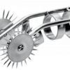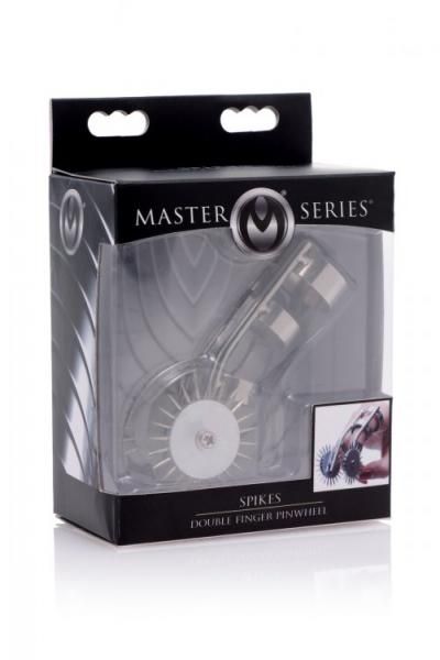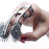Now you can always have sensation play at the tip of your finger! This unique take on a Wartenberg Wheel allows you to wear two pinwheels on a ring like device. The smooth rolling motion upon your lovers skin will produce a prickly, painful pleasure that will give them goose bumps. Blindfold them to heighten the stimulation as your surprise them with every touch. This durable instrument is secure on most fingers due to its three ring design.