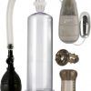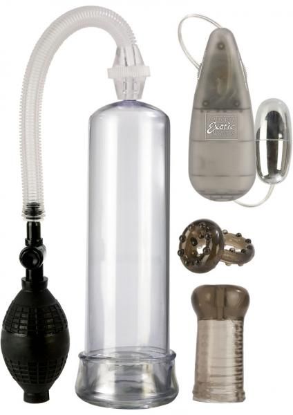 The Sta-Hard Erector Set comes with a complete assortment of handy tools to enhance, maintain, and sustain an erection including the Sta-Hard erection pump with clear cylinder, flanged base, removable soft Thermoplastic Rubber TPR donut, and EZ squeeze bulb, All Star enhancer ring, a soft, stretchy ribbed masturbator, and a powerful vibrating multi-speed bullet. Bullet vibrator requires 2 AA batteries, not included.