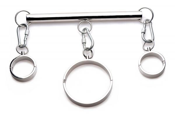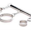 Take your bondage scenes to a fantasy realm where slaves are locked up in shackles for the amusement of their owners. This beautiful stainless steel yolk set includes sophisticated collar and cuffs with O-rings for attaching them to each other or other BDSM accessories. Each has a discreet and elegant pin-lock that opens and closes with a hex key. A connector bar and 3 carabiners create a yoke that will keep your partners hands up by their neck and out of your way as you play with their vulnerable body. The gleaming chrome is strikely attractive, with the classic aesthetic that will enhance the atmosphere of your scenes. Measurements: Collar has a circumference of 17 inches. Cuffs are 8 inches in circumference. Both have a width of .75 inches. Bar is 12.75 inches in length. Material: Stainless steel. Color: Grey. Note: Included collar, cuffs, connector bar, and 3 carabiner clips, and 2 hex keys. Warning: This is a NEW item that is not in retail packaging, usually a plain box, wrapped in plastic or a poly bag.