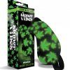 Stoner Vibes Chronic Collection Glow In The Dark Blindfold from Global Novelties. Stoner Vibes Blindfold is lightweight, flexible, and great for beginners. A fun glow-in-the-dark cannabis design with a wide elastic strap for comfort and a secure fit. Easily slip on this faux leather blindfold to play in total darkness. Feel every touch more intensely as the mask heightens your other senses!