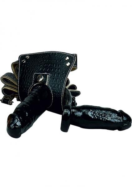 The Strap-On Satisfier will send both you and your mistress to body reeling ecstasy. The uniquely designed dual offset shafts contour around your body for perfect penetration. The custom leather harness threads through the molded form for a secure, comfortable fit, and easy removal for cleaning.