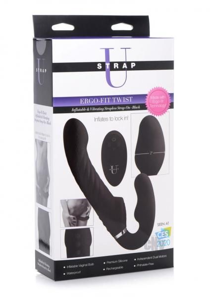 Add a new twist to your strap on sessions with Strap U 10X Swirl Ergo Fit Strapless Strap On. Insert the vaginal bulb and inflate for a snug hold on your new shaft. Users of all shapes, sizes, and experience levels will love the customizable fill, simply hold the inflation button found on the dildo shaft and remote control to find the amount of fill you need. The Ergo Fit provides extra texture to your thrusts, while the slight curve and defined head allow the wearer to easily target sweet spots like the Prostate and G-Spot. The powerful dual motors buzz both the wearer and their partner for more power when the mood strikes, choose from 3 intensities and 7 patterns of vibration. The wireless controller lets you change functions and inflation with ease. Thrust and adjust your play style without interruption, a simple push of the button on the controller changes things up! Rechargeable with the included USB charging cable and constructed with velvety smooth phthalate free silicone for a luxurious body safe experience. The IPX5 Waterproofing makes this dildo easy to clean and shower play possible. Compatible with water based lubricants only. Measurements: overall length 9.4 inches, dildo insertable length 5.6 inches, dildo width 1.5 inches. Vaginal bulb insertable length 4.5 inches, vaginal bulb width 1.5 inches, vaginal bulb width inflated 2 inches. Materials: Silicone, ABS Plastic. Color Black.