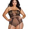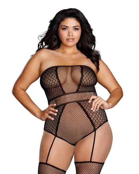 Strapless Teddy Bodystocking Black Queen Size from Dreamgirl Lingerie. Strapless teddy bodystocking. Pattern mixing details of fishnet and geometric pattern design. Strappy waistband detail. Cheeky fit. Attached garters and thigh high stockings. Dreamgirl Style No. DG0355X.