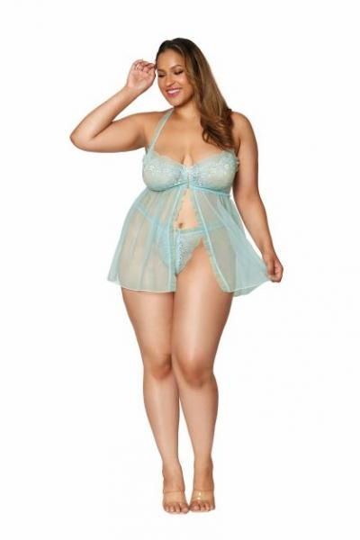Stretch Lace Babydoll Set with Ruffle Trim Mint Q/S from Dreamgirl International Lingerie. One size fits plus size ladies 16 to 20 sizes. Cups D/DD. Bust 40 inches to 54 inches. Waist 36 inches to 44 inches. Hips 42 inches to 56 inches. Weighing between 165 pounds to 275 pounds. Care hand wash in cold water. No bleach. Line dry. Dreamgirl – Holiday Collection. Comfy meets sexy. Make a statement in sexy loungewear and cozy sleepwear accented with delicate lace fabrics, embroidery, and more. Categories Babydoll Set: Lingerie, Clothing, Naughty Role Play, Babydolls, Slips, Xmas items. Restricted, Amazon Restricted. 2022.