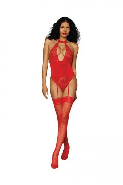 Stretch Lace and Velvet Garter Teddy Lipstick Red O/S from Dreamgirl Lingerie. Stretch lace and stretch velvet garter teddy featuring: halter neckline with hook and eye back closure. Velvet waist corset detail with adjustable back elastic straps. Open crotch. Attached, adjustable front gartersTeddy shown with thigh high stockings style DG0007 thigh highs. Sold separately. One size fits ladies sizes 2 to 14. Cups B/C. Weighing 90 pounds to 160 pounds. Bust 32 inches to 38 inches. Waist 24 inches to 31 inches. Hips 34 inches to 40 inches. Care hand wash in cold water. No bleach. Line dry. Categories: Lingerie, Clothing, Naughty Role Play, Teddies. Restricted, Amazon Restricted. 2022.