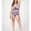 Stretch satin and eyelash lace demi cup bra and panty set. Bra includes built in halter and adjustable shoulder straps and comes with matching mid rise, high cut panty with center O ring and hip elastics. Gold hardware included in full set Stretch satin and lace demi bra and panty set.