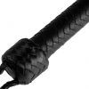 This exquisite leather impact toy is soft, supple, and has the feel of a whip that has already been broken in. The fine plaiting over a solid core and bullwhip handle make up the attractive design, for a timeless look and excellent feel. The 16 inch long braided cracker is removable, so that you may braid your own in after a particularly intense scene. Measurements: 78 inches in total length; Whip: 62 inches in length; Cracker: 16 inches in length. Material: Leather. Color: Black Warning: This is a NEW item that is not in retail packaging, usually a plain box, wrapped in plastic or a poly bag.