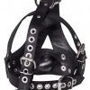 This heavy leather head harness features 2 heavy steel O-rings and 2 D-rings to which you can attach any number of accessories. The durable, thick leather and steel grommets are perfect for intense play. Hand made with quality leather and designed for ultimate restriction while maintaining comfort. 7 steel rivets allow you to adjust the collar, and an additional 7 steel rivets at the top of the head allow you to adjust the fit from front to back. The chin strap features 2 sizing snaps as well. A triangular cut out at the front allows the nose to poke through, while the circular mouth opening has snaps to accept the removable leather gag. Measurements: Gag measures 2.5 inches in width, 1.25 in height, 4 inches in circumference . Material: Leather, metal. Color: Black. Note: One size fits most