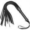 This simple leather flogger has about 18 strands, each 18 inches long and 0.5 inch wide. Each strand is cut at an angle for a little extra bite. A generously sized wrist loops ensures a firm grip, and the 6 inch long leather wrapped handle is decorated with silver studs. Measurements: 24 inches in total length, tails measure 18 inches in length; Handle is 6 inches in length and 1 inch wide. Material: Leather. Color: Black