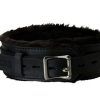 This collar is the ultimate blend of comfort and durability. It is fundamentally a wide strap of thick leather lined with two layers of ultra soft faux fur. It is wrapped with a 1 inch wide leather strap. The lockable buckle on the strap is compatible with any small padlock. With the fur included, this collar is an impressive 2 3/8 inches wide. Nine sizing slots ensure a comfortable fit.