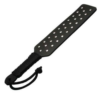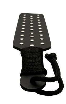 The dense, thick, heavy rubber of this studded spanking paddle is sure to put real weight behind your swing. A rope bound handle ensures a steady grip. The glittering silver studs that line one side of the paddle serve as a visual adornment if you choose to use the smooth rubber side, or flip it over for an extra metallic bite. Rubber is a durable, waterproof, and virtually maintenance free material, so this severe impact toy is sure to give plenty of hassle free pummeling gratification. Measurements: 16.5 inches in length, 3.25 inches wide and 0.25 inches thick. Material: Rubber, metal, rope. Color: Black Warning: This is a NEW item that is not in retail packaging, usually a plain box, wrapped in plastic or a poly bag.