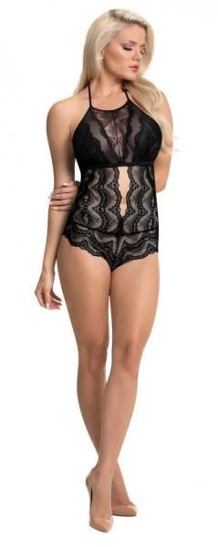 Sugar and Spice Teddy Black L/XL from Magic Silk Lingerie. From the Exposed by Magic Silk collection, this style includes: a teddy featuring a high neck design with elastic tie back straps at the neck and hook and eye closures in the back, cutout accents in the front and back, soft lace details and a snap crotch. Ladies sizes large to extra large fits women dress sizes 12 to 18. Care hand wash in cold water, no bleach, line dry. Color Black.