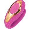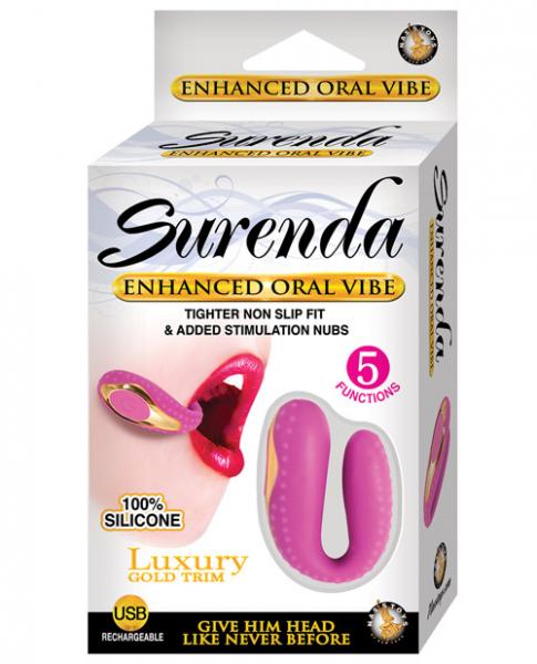 Surenda Enhanced Oral Vibe Pink with Luxury Gold Trim. 5 functions. 100% Silicone. USB cable included. Waterproof vibrations. Phthalate free, RoHS compliant material Vibe Silicone, Control Area ABS plastic. Length 2.25 inches, insertable length 2 inches diameter 0.625 inch, circumference 2 inches. Rechargeable, no batteries necessary.