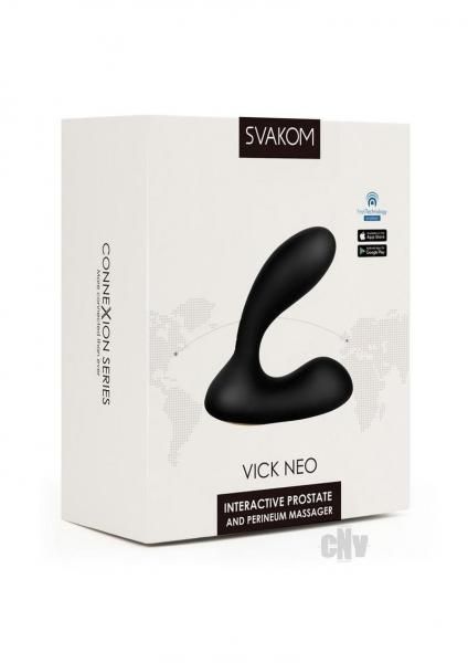 Vibrating Pernieum andamp; Prostate Massager. Sleek aesthetics and innovative technology come together to create a wild adventure packed tightly in an easy to use prostate andamp; perineum vibrator. Designed to apply firm stimulation to the perineum, Vick Neo offers a variety of different modes and intensities. Stimulate the prostate and perineum simultaneously to provide exceptional stimulation to sensitive areas. Fully flexible, Vick Neo can be manipulated to allow double penetration and control stimulation on target areas. An ergonomic design paired with a comfortable size allows for easy ion regardless of experience. Part of SVAKOM`s Connexion Series, Vick Neo comes with all the benefits of modern technology. Sync with interactive content to boost your sessions online, or connect to the SVAKOM App for features including music mode and long-distance remote play. andnbsp; Long distance APP-controlled technology Allows you to experiment and enjoy with whoever you want, wherever you are. andnbsp; Double Stimulation Uniquely designed to stimulate the prostate and the perineum for a far deeper and more intense pleasure experience, both internally and externally.Adjustable at various angles, ready to please anyoneandrsquo;s anatomy. andnbsp; Exhillarating Modes Offering 7 modes with 5 levels of intensity, 35 different ways to take you from the beginning all the way to the ultimate orgasm. andnbsp; Interactive Content Experience videos like never before with interactive content. Connect to your favorite websites and enjoy a wider range of pleasure.