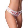 Indulgence knows no bounds with our Sweet Treats Crotchless Thong with Edible Lube. This crotchless thong is as smooth as a moonlit stream. Fruit prints and delicate lace trim whisper forbidden delights. And, with a split crotch, they beckon those who dare. Each pair comes with two (3ml) Wicked Sensual Care edible lube packettes flavored to match the fruit on the panty, ensuring a journey into silky ecstasy.