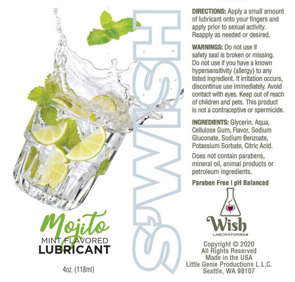 Cocktail inspired lubricants. Swish Mojito Mint 4 fluid ounces from Little Genie Products. Whether you like to play alone or with friends, Swish cocktail inspired lubes are made from top shelf ingredients. Pick your pleasure and enjoy the smooth glide of Swish lubricants. Directions: apply a small amount of lubricant on your fingers and apply before sexual activity. Reapply as needed or desired. Warnings do not use if safety is broken or missing. Do not use if known hypersensitive or allergies, to any listed ingredient. If irritation occurs discontinue use immediately. Avoid contact with eyes. Keep out of reach of children. This is not a contraceptive or spermicide. Ingredients Glycerin, Water, Cellulose Gum, Flavor, Sodium Benzoate, Potassium Sorbate, Citric Acid. Does not contain Parabens, Minerial Oil, Animal Products, or Petroleum Ingredients. Paraben free pH Balanced. Mint Flavored Lubricant. Wish Laboraties. Little Genie Productions LLC. Made in the USA. *Spelling error J is H. Mojito both sizes 2oz and 4 ounces. Correction coming.