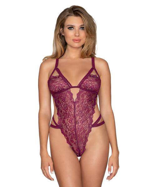 Teddy Mulberry O/S from Dreamgirl Lingerie. Crotchless Strappy Lace Teddy features stretch galloon lace teddy with unlined triangle cups, peek-a-boo cutouts, open crotch, criss cross adjustable straps and G-String back. Style: 10551. One size fits ladies sizes 2 to 14. Cups B/C. Weighing 90 pounds to 160 pounds. Bust 32 inches to 38 inches. Waist 24 inches to 31 inches. Hips 34 inches to 40 inches. Care hand wash in cold water. No bleach. Line dry. Dreamgirl – Lingerie Collection. 2022. Comfy meets sexy. Make a statement in sexy loungewear and cozy sleepwear accented with delicate lace fabrics, embroidery and more. Last image is a size chart for Dreamgirl International. Categories: Lingerie, Clothing, Naughty Role Play, Teddies, Sleep and Lounge. Amazon Restricted. 2022.