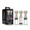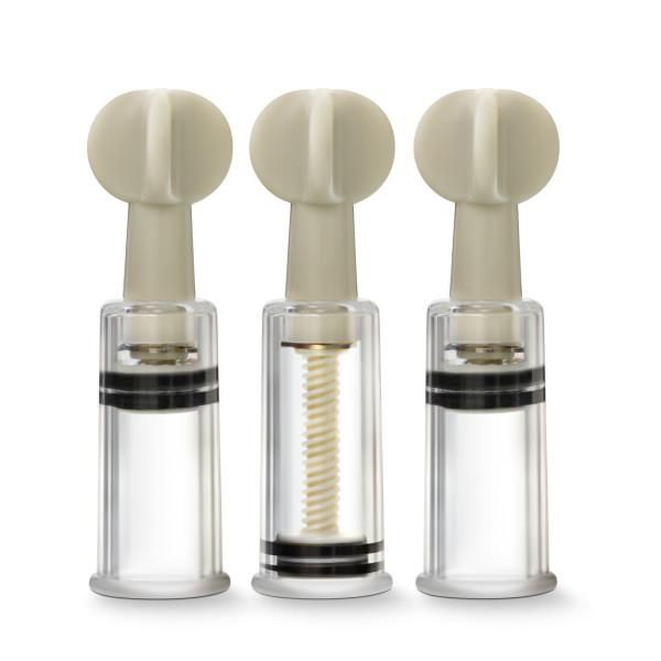 Temptasia Clitoris And Nipple Twist Suckers Set of 3 Clear from Blush Novelties. Triple the pleasure. Set of 3 suction cylinders to stimulate nipples and clitoris. Sensation. Each crystal clear cylinder delivers engorgement and heightens sensation. Explore. Fully adjustable cylinders allow you to play with different levels of pressure. Peace of mind. Made of body safe Acrylic. Contains no fragrances, phthalates or latex. Size 0.8 inch inner diameter for each cylinder.