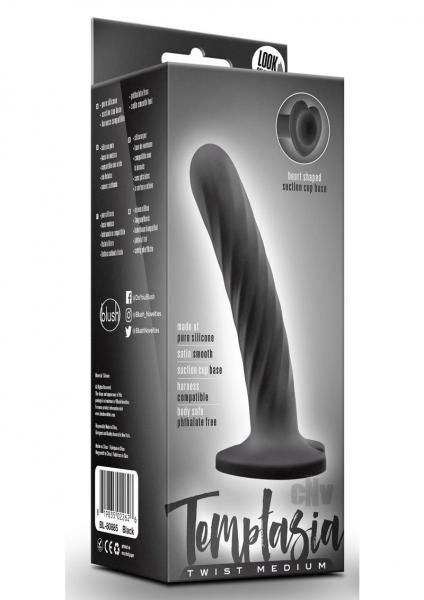 Temptasia Twist Medium G-Spot Dildo Black from Blush Novelties. Stimulating. Twist dildo design for rotating G-Spot pleasure. Cute. Unique heart shaped suction cup base. Versatile. The base is also harness compatible. Peace of mind. Made of Satin Smooth, body safe Silicone. Contains no fragrances, phthalates or latex. Dildo size 5 inches in total length, 4.5 inches insertion length by 1 inch in width. The Temptasia Twist Medium delivers swirling texture that is perfect for gentle G-spot or anal canal stimulation! Its cute heart shaped base includes a strong suction cup and is harness compatible. Either solo or with your partner, the Temptasia Twist is a fun, stylish addition to your playtime. The Twist Medium Dildo has a 1 inch girth makes it an excellent choice for anyone who is looking for a thinner toy. With a satin smooth silicone finish, this dildo is made for comfort. Its 100% platinum cured silicone is body safe and easy to clean. Just boil for 5 minutes to fully sanitize, or wash with mild soap and water during everyday use.