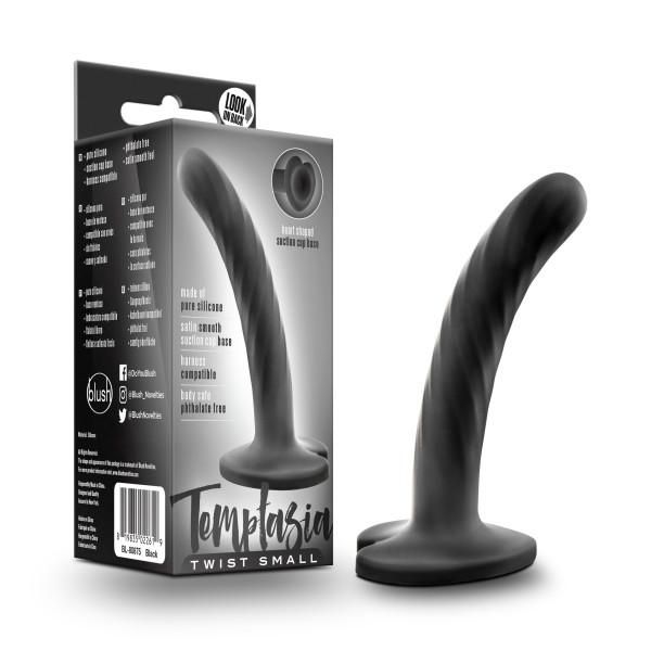 Temptasia Twist Small G-Spot Dildo Black from Blush Novelties. Stimulating. Twist dildo design for rotating G-Spot pleasure. Cute. Unique heart shaped suction cup base. Versatile. The base is also harness compatible. Peace of mind. Made of Satin Smooth, body safe Silicone. Contains no fragrances, phthalates or latex. Dildo size 5 inches in total length, 3.75 inches insertion length by .75 inch in width.