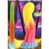 Take your fantasy roleplay, kinky cosplay or creative role play further with tangible fantasy toys from Creature Cocks! This Glow-In-The-Dark Tentacle Dildo might just be the perfect toy to hit every deep spot within you, light up the night, and excite you and your partner! From the light blue base the tangle of thin tentacles reach up towards the round, egg-shaped orb that they hold. Each ropey tentacle is either smooth or textured with little suckers that will massage you and add unique shapes to the shaft. The round egg at the tip helps to massage your P-spot or G-spot and add extra pleasure! Expose it to sunlight or UV light so that it glows neon blue, orange and green in the dark! The wide base provides powerful suction so you can go hands-free by placing it on any flat surface to keep it in place. You can also combine it with a compatible strapon harness for pegging play! Made out of premium, phthalate-free silicone, it has a firm core and soft, silky surface. Use only with water-based lubricants for best results. After play is over, wash the dildo with warm water and soap and use a toy cleaner to spray clean. Wipe dry and store in a cool, dark place out of direct sunlight. The most exciting thing about deep sea diving is that you get to see things that no other human has ever seen. You take the small personal submarine down deeper and shine a light to find your way. You safely anchor your sub in place and then turn off the lights and wait. It doesn’t take long before you start to see the glowing fish and deep sea creatures begin to swim by… but then you see one that is so bright, so unique, that you gasp in shock! You grab the controls and capture the most brilliant, glowing squid you’ve ever seen! As it pulls it inside the ship and deposits it in the pressurized water tank, you look carefully at it. The thin tentacles spread out and the glowing pules and fades as the lights turn on. You head up to the upper level ship and dock. Exhausted, you fall asleep so you can examine this creature in the morning. You don’t make it through the night, though. You hear something wet splash onto the floor. As you open your eyes you see something glowing across the room in the specimen tank. As you get up to check it out, your vision blurred from fatigue, you slip on something wet on the floor and land hard on your back. As you open your eyes a second time you see and feel the squid stretching its arms across your body. Suddenly you are all too aware of your nakedness as it touches and tastes you through its suckers. You watch in awe and with some nervousness as it reaches inside itself and then pulls out a glowing orb. Is it an egg? It holds tightly to it and then, to your shock, it reaches between your thighs. You want to stop it but your limbs are heavy, you feel like you’re drunk! There must be some kind of secretion from the squid’s slime that is making you feel drowsy and intoxicated! You are helpless to stop it as it inserts its egg inside you… and honestly, it feels so good you don’t want it to stop! Measurements : Overall length: 8.5 inches. Insertable length: 7.5 inches. Narrowest insertable diameter: 1.7 inches. Widest insertable diameter: 2.1 inches. Materials : Silicone Color : Blue, Pink, Yellow