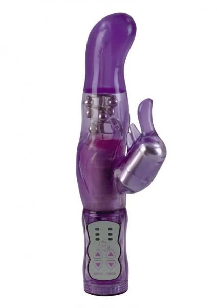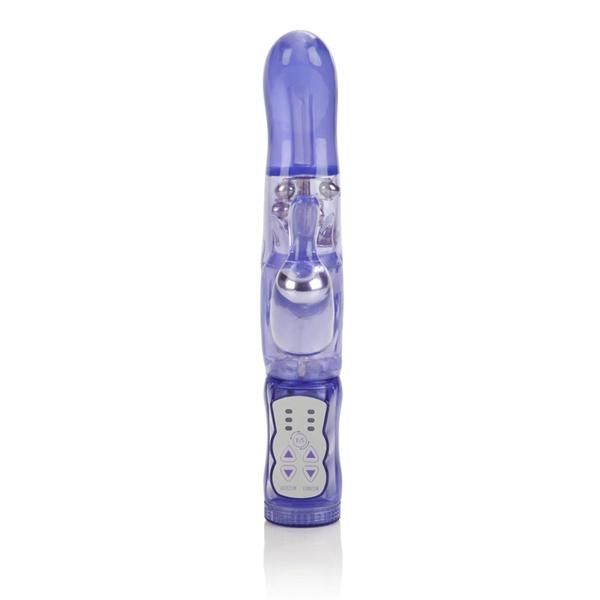The Original Wild G Purple Vibe. The number one selling G! Tiered triple prongs for maximum stimulation, 3 speeds of vibration and 3 speeds of non-jamming multilevel rotating beads. Reversible head rotation. Easy to use controller. Safe and pure for body and pleasure. Made using phthalate free, non-toxic materials Thermoplastic Elastomers TPE shaft, clitoral stimulator vibrator, ABS plastic cap, ABS plastic with silver plating beads. Shaft measures 5 inches long by 1.75 inches wide. Clitoral stimulator measures 2.5 inches long by 2 inches wide. Bulk weight 11.6 ounces. Vibrating sex toy requires 3 AA batteries, not included. Do not leave batteries in the vibrator between uses. Always clean before and after use. A water based lubricant is recommended. Category: For Women, Vibrator, Vibrators. The Original Wild G Vibrator is a registered trademark for California Exotic Novelties. Sex toys and sexual wellness.