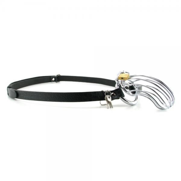 Dare your subject to get a hard on and watch as they struggle inside the prison like confines of the cage. No matter how aroused he gets, the curved steel shape prevents your sub from getting erect, but the open design still allows them the freedom to piss when they need to. You hold the key to pleasure, so make sure they do as you say before you grant them their freedom.