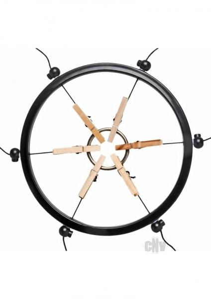 When engaging in hot bondage action, there are times when you want to bring their pussy into play. The Pussy Spreader allows you to take a set of attached clothespins and use them to spread the lips of the vagina wide. Then you can feel free to penetrate with a dildo, vibrator or whatever toy you choose. The Pussy Spreader is simple to use. Just detach the 6 clothespins from the center ring and put the ring to the side. Then place the circle around the vaginal area of your partner. Now take each clothespin and apply it to a section of your partners vaginal lips. Use the adjusters on the outer edge of the metal ring to situate the lips as wide apart as you wish. With your partner in this position, feel free to penetrate them deep with your favorite long dildo or stimulate her clitoris with a vibrator. The choices are totally up to you. You can clip the clothespins to the metal retaining ring to help keep its shape when not in use. It also can double as a cock ring! Measurements: 10 inches in diameter Material: Metal, wood Color: Black Note: Comes with metal pussy spreader, 6 clothespins, and metal retaining ring Warning: This is a NEW item that is not in retail packaging, usually a plain box, wrapped in plastic or a poly bag.