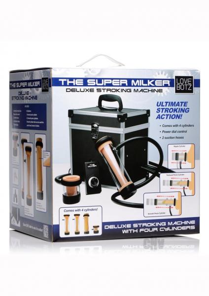 Now with more cylinders and textures for even more ecstasy! Let the Super Milker Deluxe Stroker Machine do all the hard work for you! This love machine is specifically designed for automatic stroking and sucking, with a total of 4 cylinders for a variety of sensations. This multi-speed machine houses everything you need discreetly in the locking top of the case. Just plug the hose into the cylinder and use the dial to control how fast or slow you want it. Three different cylinders are included: the large, smooth cylinder is specially designed to suck your shaft, at nearly 9 inches long and lined with supple rubber for a tight seal. You will love it so much that we have included two of them! A third long cylinder will surround your entire shaft with soft, delicate nubs for a unique massage. Finally, the smaller cylinder is for more targeted pleasure, such as your cock head or even the clitoris or nipples. Use the Milker alone or with a partner for foreplay, solo play, or anything you can dream up. This updated machine is designed to bring you heightened pleasure with more options. All accessories store easily in the top compartment, which has a lock and 2 keys for the ultimate in portable and pleasure and privacy.